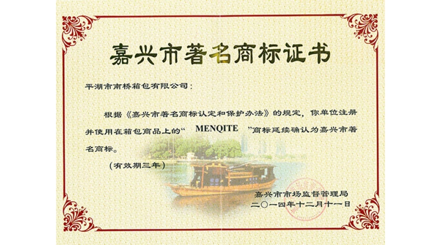 2014年嘉兴市著名商标证书
